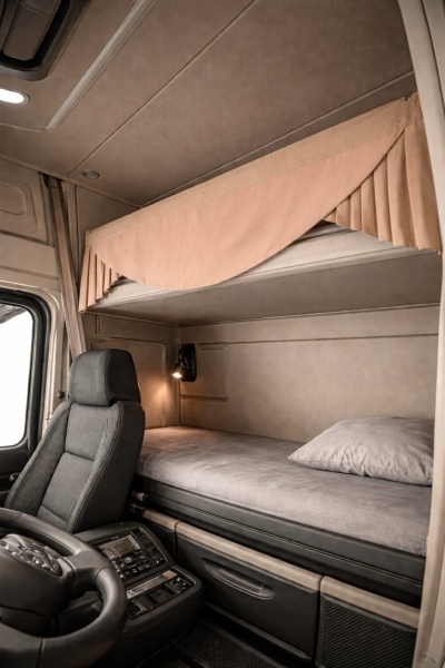 Zasłona tylnego łóżka to nie tylko element dekoracyjny, ale przede wszystkim funkcjonalne wyposażenie kabiny,  Idealna dla kierowców zawodowych spędzających długie godziny w drodze.